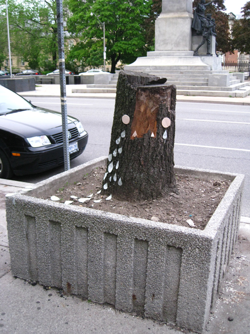 "Tear Me" is on the West side of University street, just North of Queen Street West. I forgot to put up its arms and remembered it just before I went home that evening. The sun was setting, so I didn't get a very good photo of it. It was cute with two arms!
